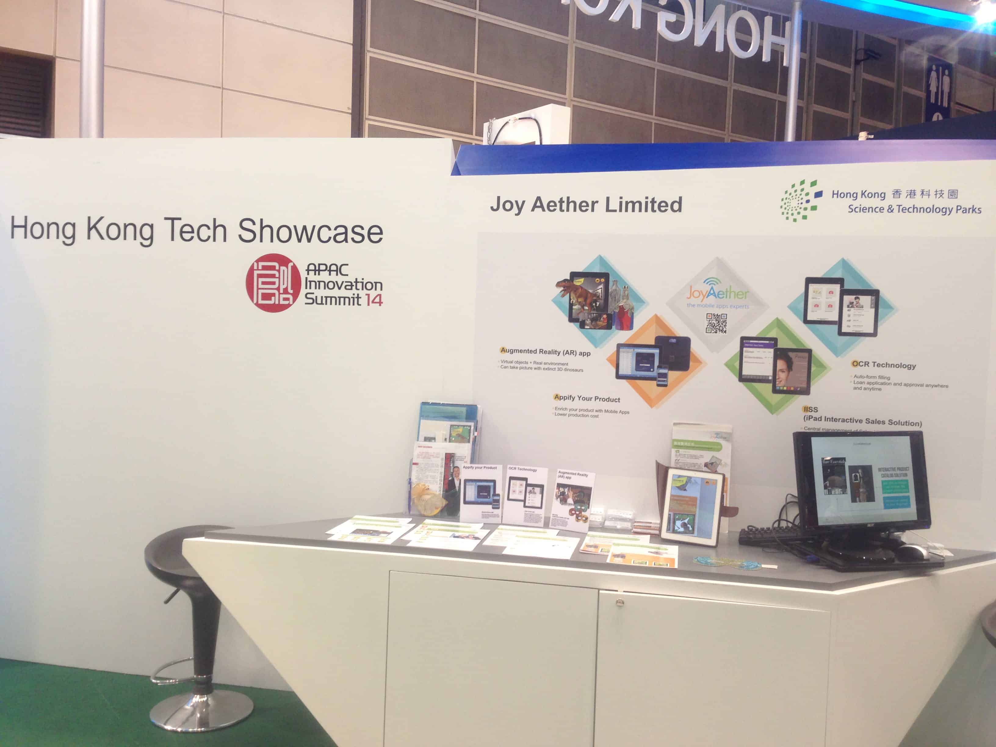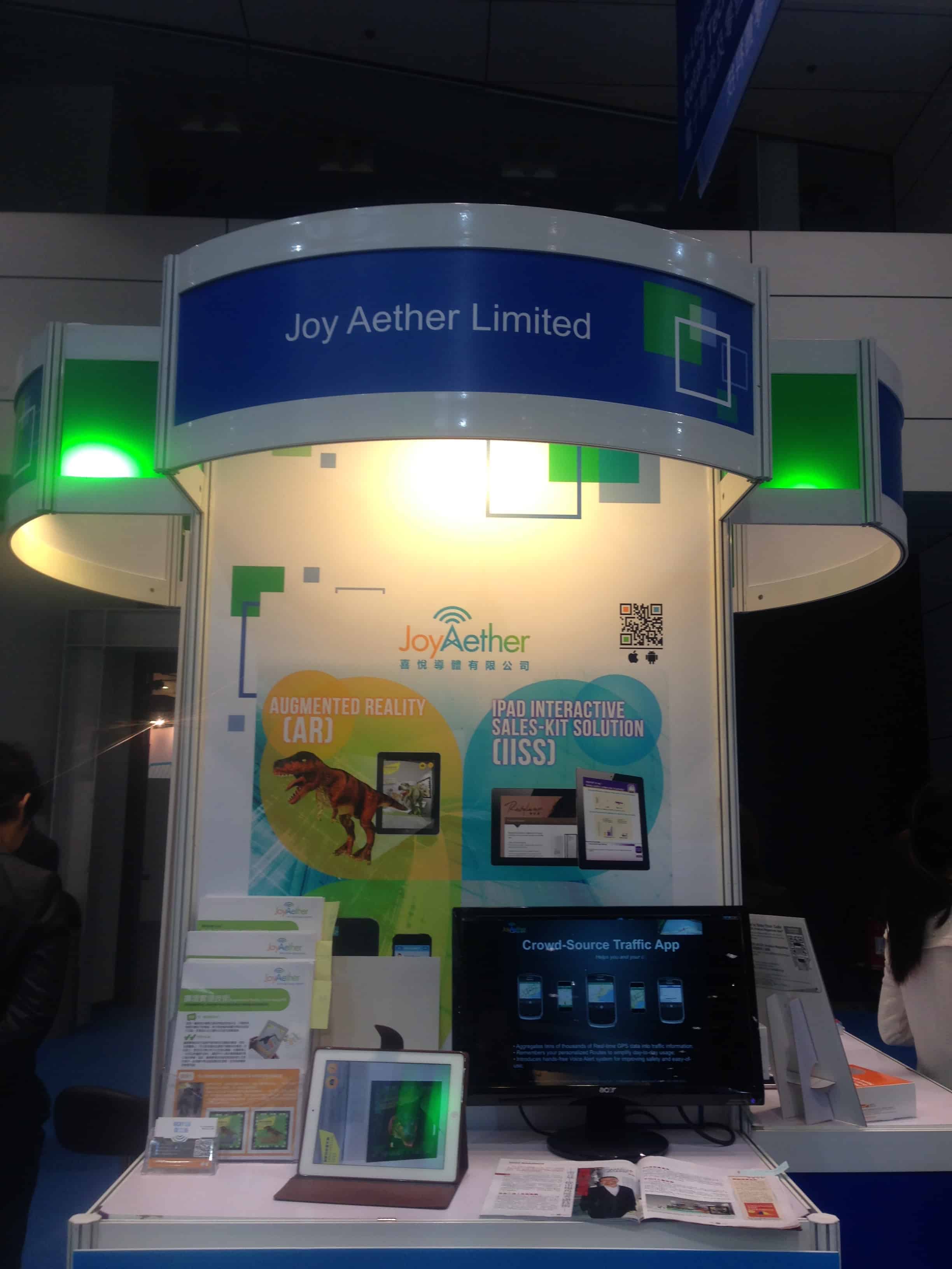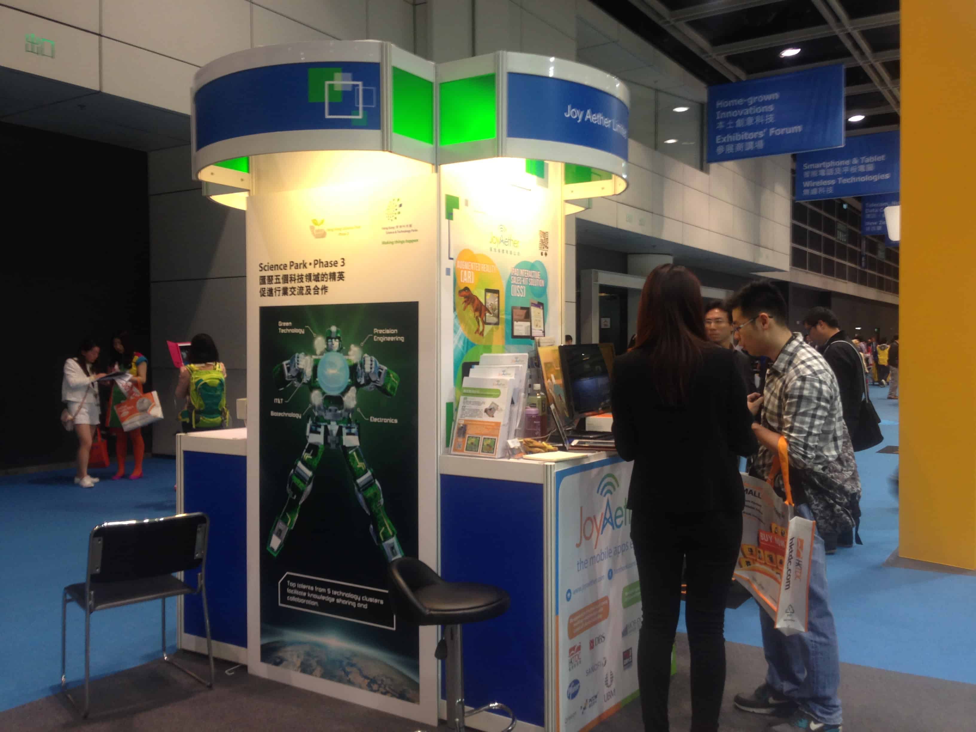 Inno Design Tech Expo had been held during 4-6 Dec 2014 in Hong Kong Convention and Exhibition Centre. Our booth 1A-C02 was in the Hong Kong Tech Showcase with the professional collaboration with local universities, research institutes and industry leaders. We are excited to have received many visitors’ interests in our highlighted mobile solutions shown on the booth backdrop. More amazingly, we are very honoured to have the chairman of Hong Kong Science and Technology Parks Corporation, Mrs. Fanny Law (羅范椒芬), to show interest to Joy Aether.
